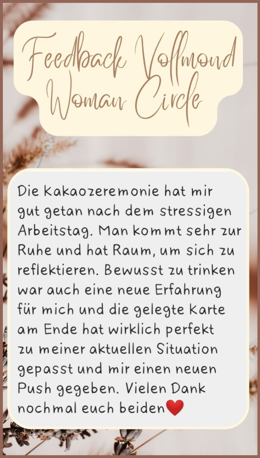 "The cacao ceremony did me good after a stressful day at work. It really calms you down and gives you space to reflect. Drinking mindfully was also a new experience for me, and the card reading at the end really suited my current situation perfectly and gave me a new boost. Thank you both again."