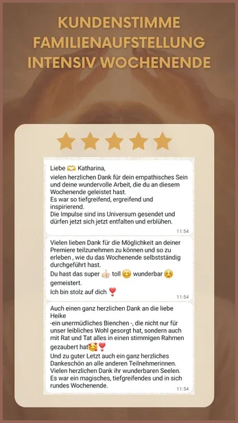 Hello my dear, I thought of you this morning and would have loved to come because I dreamt about my father. I'll bring this topic up at the next family constellation session, and my mom and a friend of mine would also love to come, but that can wait until October. My feedback: Your work was magic. Together you helped us open up and free ourselves from chains that were too heavy for us to carry alone. You left no stone unturned and guided us wonderfully. It was very interesting and profound on a personal and general level. Everything was harmonious and coherent. The location, the people, the food—it was like coming home. I'm sad it's over, but it was also very intense work from all of us, and that's why the timing was so good. I'm looking forward to seeing you again. Truly, you always find people you can talk to spiritually, but growing together, supporting each other through such processes, and creating this openness and safe space is an art. You open paths to my soul and give me a place by your side, a place where I can come to be free and be myself. Thank you, thank you, dear Katharina.