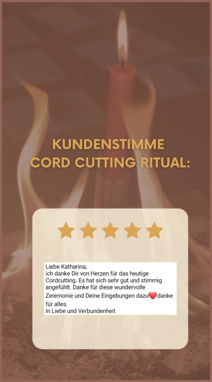 "Dear Katharina, Thank you from the bottom of my heart for today's cord cutting. It felt very good and harmonious. Thank you for this wonderful ceremony and your inspiration for it. Thank you for everything. With love and connection."